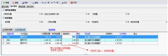 由生产计划部门接受审核通过后的“生产指令单”,结合成品的BOM结构组成,自动获取BOM中物料的现有库存量、订单占用库存量,计算出 当前分析的生产指令单可扣库存的情况,根据可扣库存情况生成“待采购数量”,从而形成采购计划或采购需求,也可直接生成采购订单。